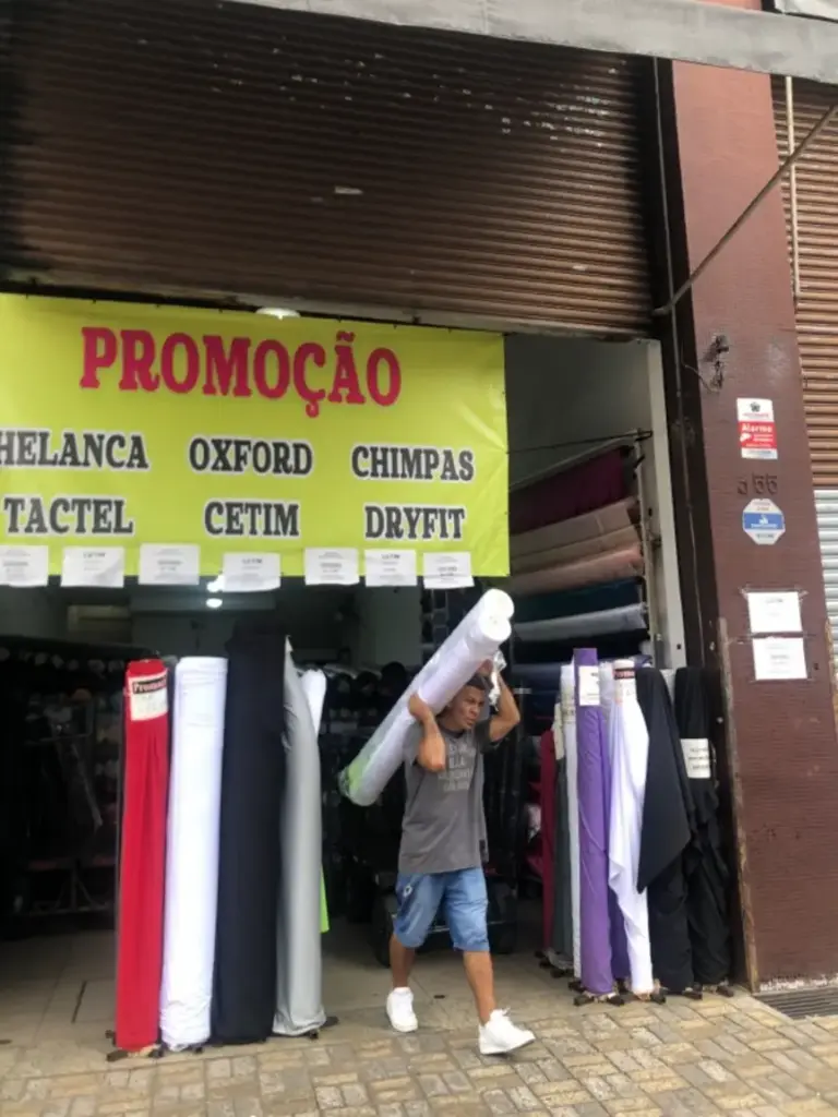 Loja de tecidos com atacado e varejo e funcionamento ao longo da semana, indicada para quem precisa comprar bases têxteis com frequência para produção e reposição.